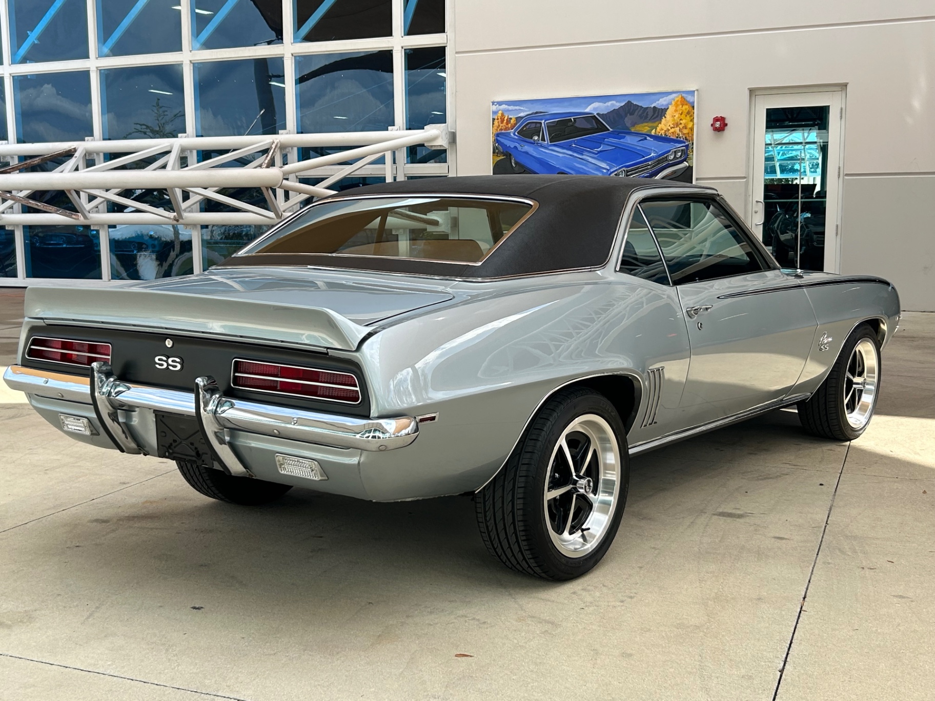 The 1969 Camaro SS 396 stands out with its Cortez silver paint and black Houndstooth interior, showcasing a blend of style and power. The car is equipped with a robust 396 cubic inch big-block engine featuring an Edelbrock manifold and a Holley performance carburetor. This setup is enhanced by chrome valve covers, a high-volume Griffin aluminum radiator, and Flowmaster mufflers, delivering both impressive performance and a refined engine bay.