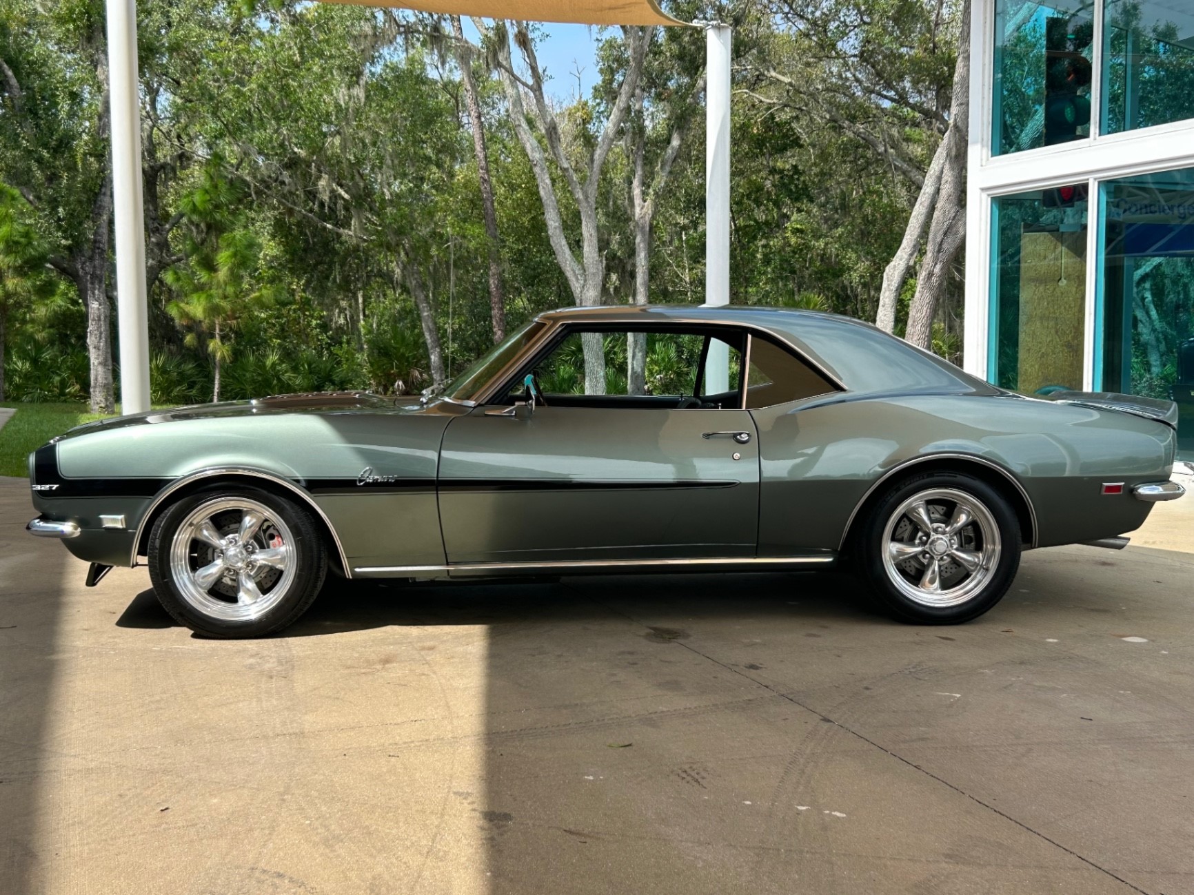 The 1968 Chevrolet Camaro stands as an iconic classic, enhanced by a meticulous restoration. This model features a subtle green/grey paint job complemented by a black interior. The heart of the Camaro is its original ME code 327 cubic inch engine, now rebuilt with performance upgrades including an aluminum intake, Edelbrock carb, and chrome valve covers. The engine bay is clean and detailed, with additional features like vintage air conditioning, power steering, and power brakes.