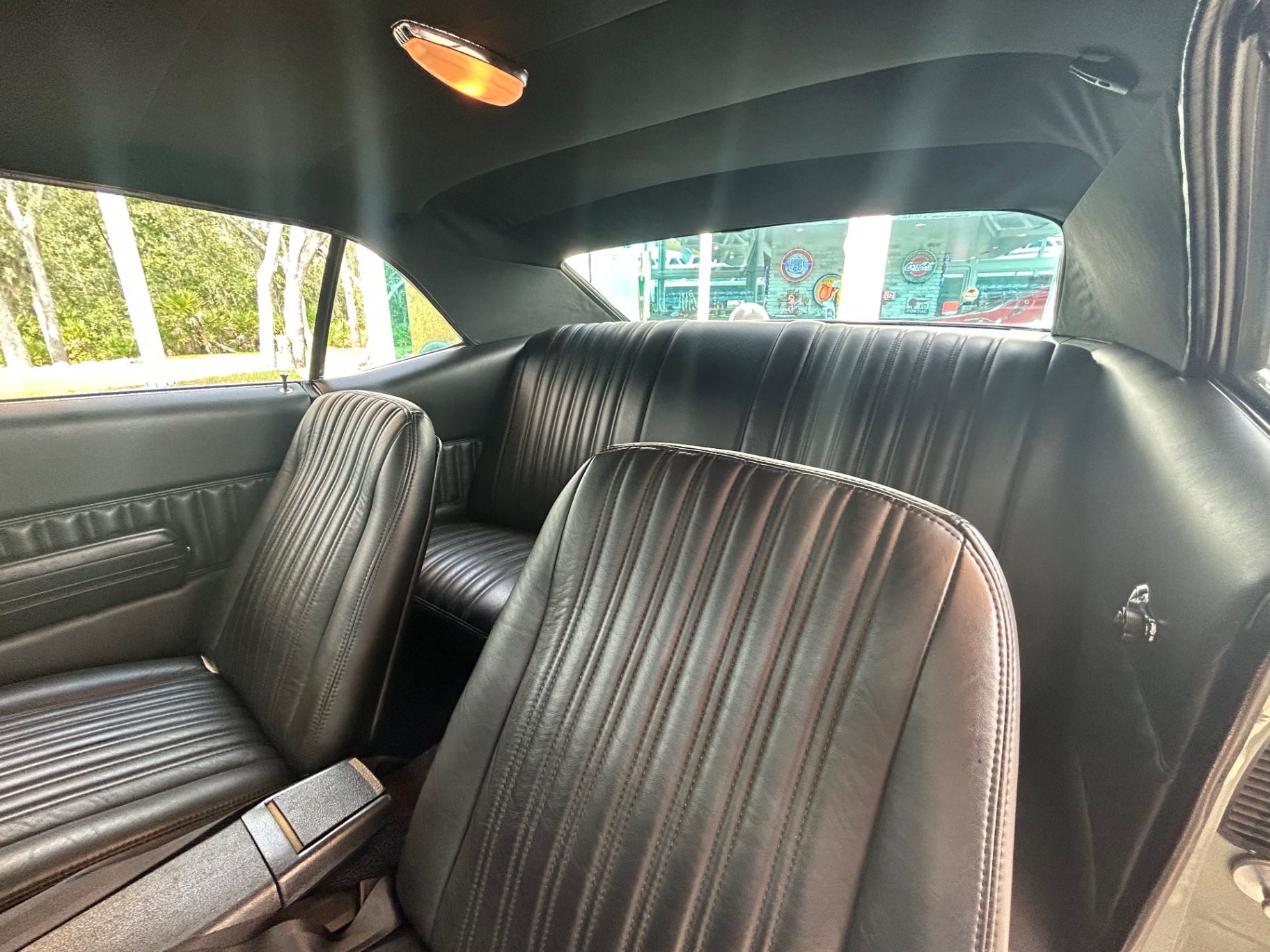 Inside, the restored interior maintains a factory look with black twin bucket seats, a matching rear seat, and a wood grain steering wheel. The factory dashboard, gauges, and a “Horseshoe” shifter add to its classic charm. The Camaro’s exterior is highlighted by a black bumblebee stripe, front chin spoiler, and rear decklid spoiler, riding on polished 5-spoke mag wheels. The dual exhaust system contributes to its sporty appearance and sound. Complete with a restored trunk and a book documenting the restoration, this Camaro offers a blend of originality and enhanced performance, making it a standout classic.