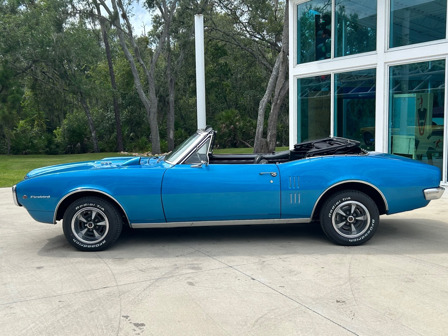 Inside, the black interior features twin bucket seats, a matching rear seat, and a center console with a chrome shifter and white ball. Burlwood accents on the dash and a factory PMD steering wheel complete the classic look. The convertible top is black canvas, and the exterior is finished in Pontiac Blue with integrated front bumpers, 400 trim, and Rallye wheels with BF Goodrich Radial TA tires.