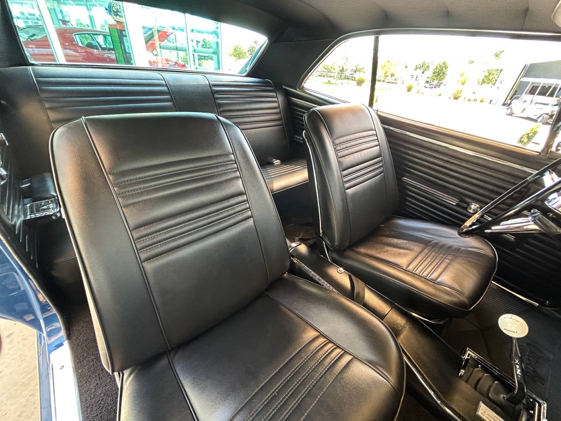 The exterior includes a cowl induction hood with chrome power bulges, new front grille, and polished aluminum billet hood hinges, emphasizing its classic muscle car appeal. Inside, the black interior is equipped with front bucket seats, a factory dashboard with accurate gauges, and a center console with an electric clock. Additional features include a Hurst chrome 4-speed shifter and a set of BF Goodrich radial tires on American Racing rims.