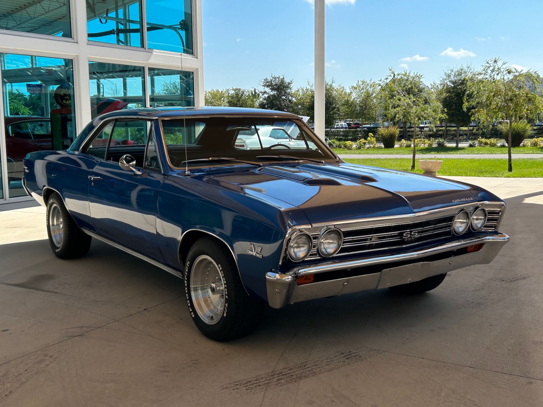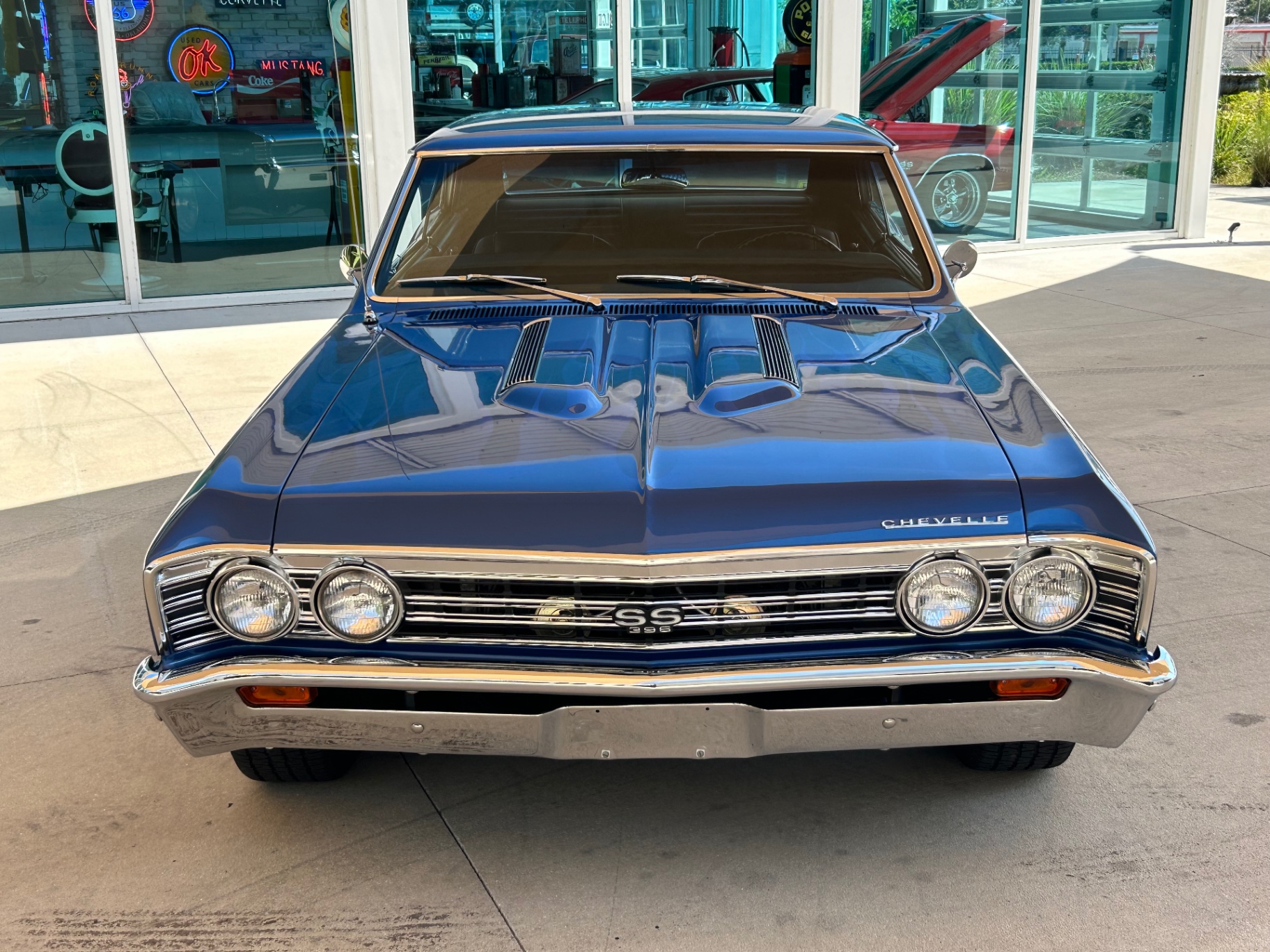 This 1967 Chevrolet Chevelle SS 396 stands out with its striking Marina Blue paint and ghost flames, showcasing a thorough restoration. It's a true SS model, verified by the distinctive #138 VIN, and features a formidable 396 cubic inch engine. This powerplant, originally from a 1970 402 block, includes high-performance upgrades like a mild cam, long tube headers, and dual Flowmaster mufflers. The engine is coupled with a Muncie M-20 4-speed transmission and a 12-bolt rear end with 4.10 gears, delivering robust performance.